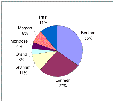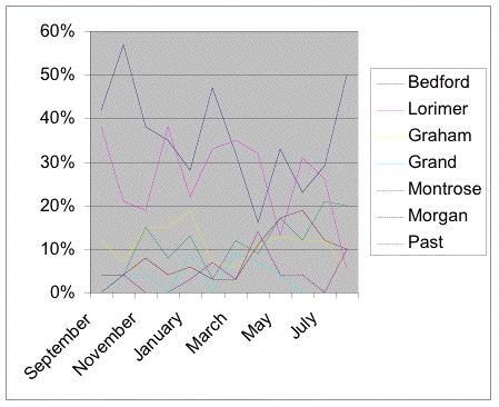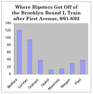 From the first light of September 2001 through the end of August 2002, I covertly noted movings and goings on the L line. Upon departure from First Avenue, I chose those two people on the train who most resembled “Hipsters,” as they are commonly imagined. I then noted at which stop they departed the train, and have assembled my charts from a year’s worth of this information. Due to my own daily departure at Morgan Avenue I could collect no data after that stop, and had to lump all those results into the “Past” category. Nonetheless I hope this information might prove useful to those students of trains, “Hipster” migration, and above all the human spirit.